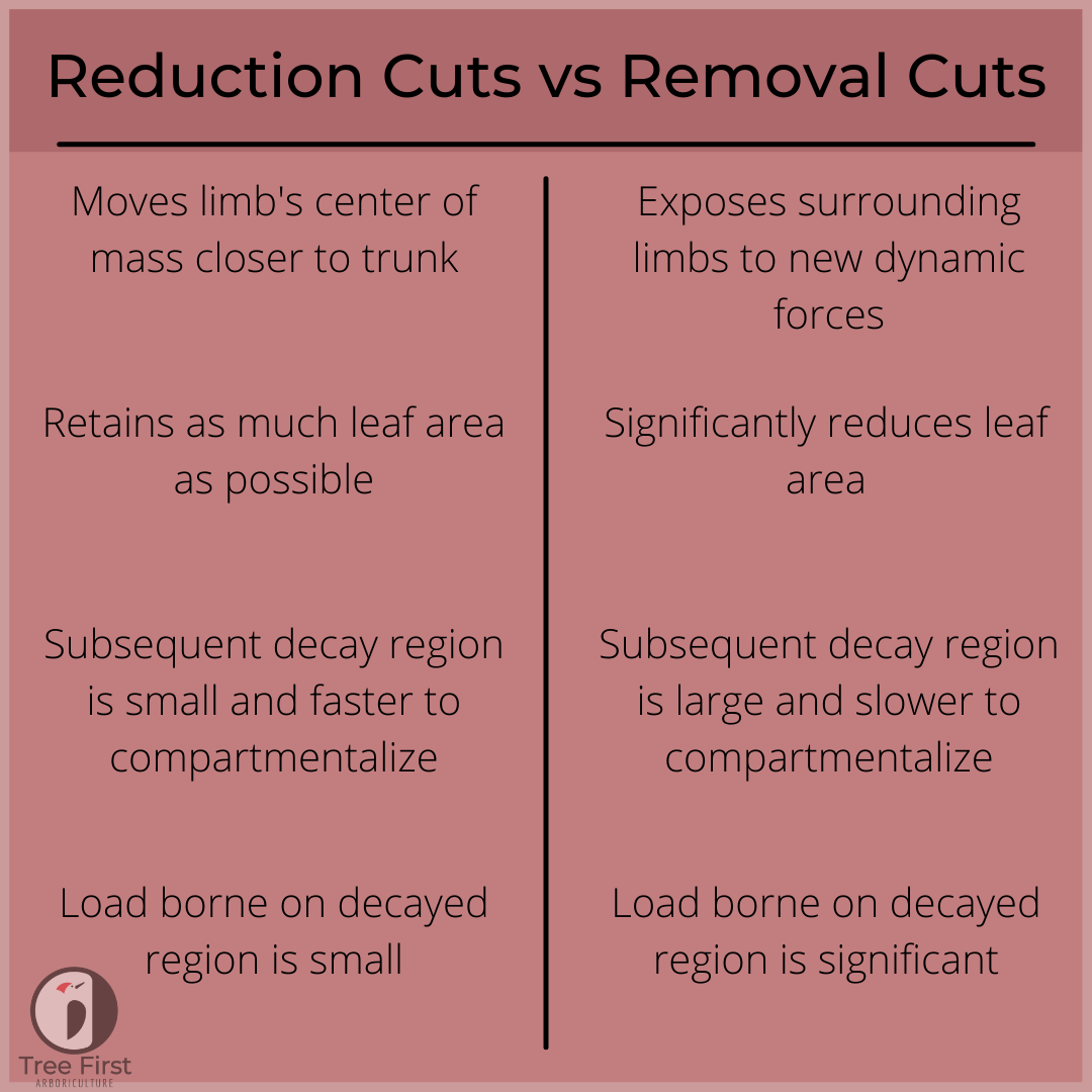 A tree’s capacity to compartmentalize wounds diminishes as the cut sizes increase, regardless of the type of cut being made. Removal cuts are generally larger than reduction cuts, and the placement of their subsequent decay is much more detrimental than reduction cuts. This is because the loads borne on the decayed regions in the trunk following large removal cuts are much greater than loads borne out on the periphery of the crown.