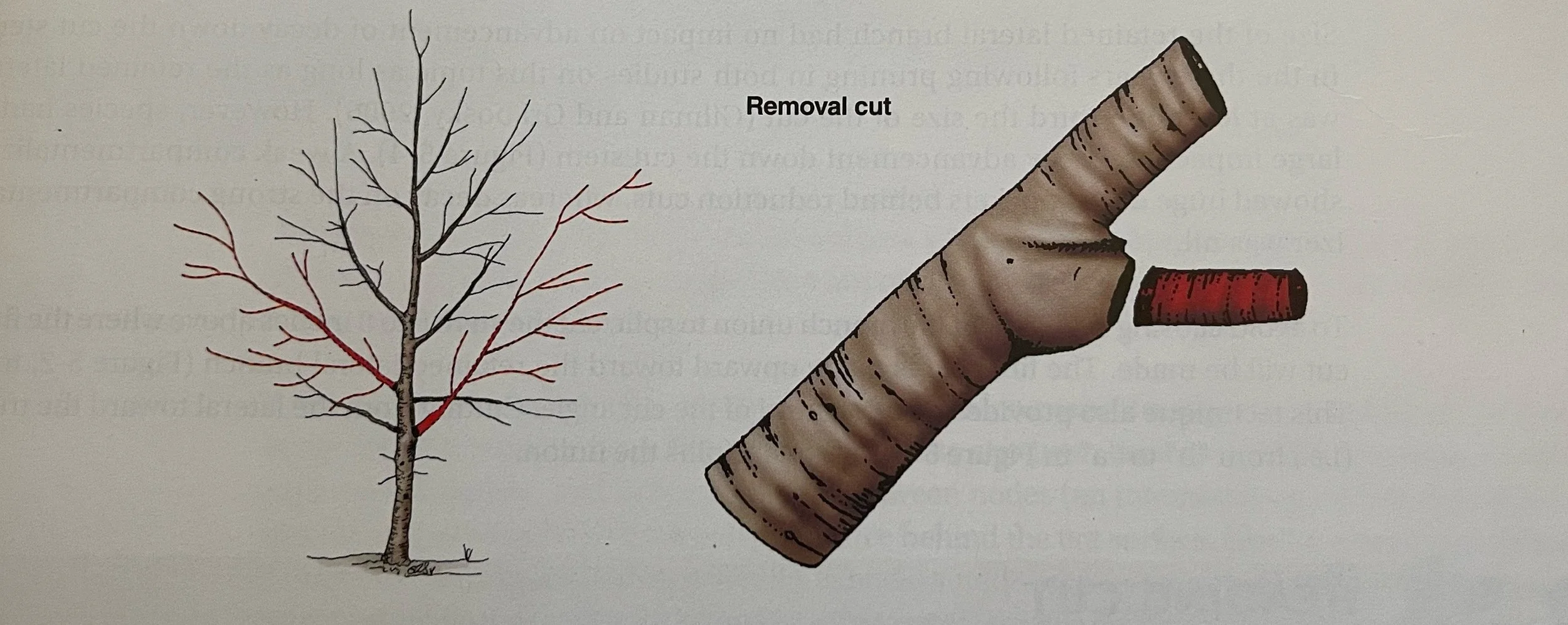 ...removes a branch back to its parent stem or trunk and retains the collar… In contrast to a reduction cut, the part of the plant that remains following a removal cut has a larger diameter than the part that was removed. Examples include removing a limb from the trunk...